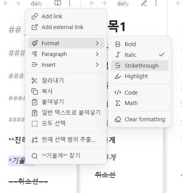 만약 마크다운이 처음이라면, `우클릭 > Format` 을 확인해 주세요. 참고로, `글자색`은 마크업으로 사용해야 하며, `형광펜`은 특정 색을 임의로 설정할 수 있는 플러그인이 있습니다. 또한, 왼쪽 정렬, 오른쪽 정렬 등의 문단 정렬도 언어에 따라서 바뀔 수 있지만, 왼쪽 정렬로 고정되어 있습니다.