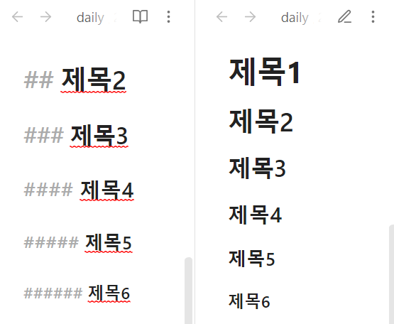 앞서 계속 설명했던 것처럼 왼쪽은 에디터에서 보는 것, 오른쪽은 옵시디언입니다.