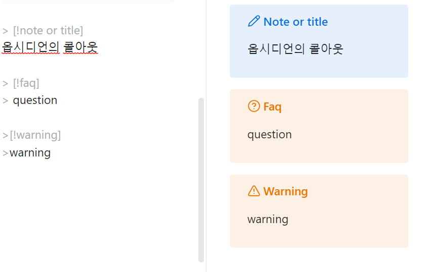 인용구와 보통 같이 소개를 하는데, 콜아웃의 경우 노션과 비교하기 위해 다르게 넣었습니다. 만약, 옵시디언으로 작성한 내용을 노션으로 가져오고 싶다면, 인용구와 콜아웃은 전부 지워야 됩니다. 둘의 문법이 다르기 때문이죠!