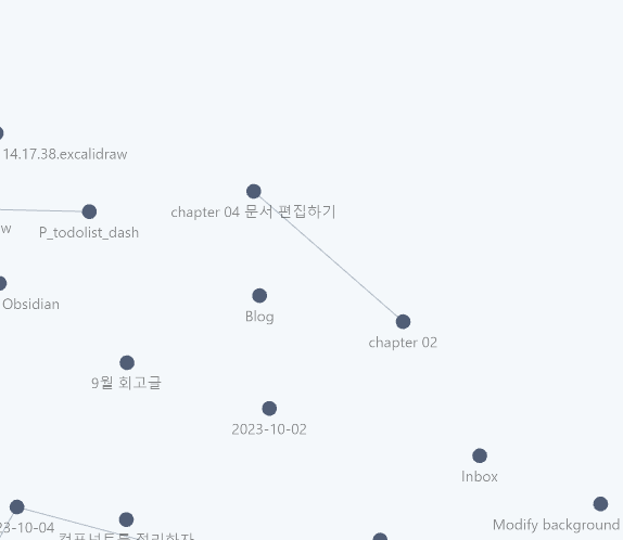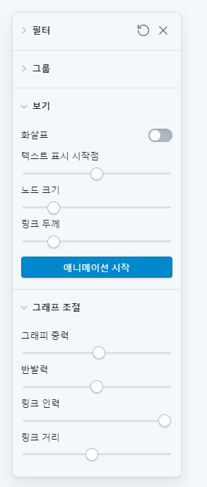 이렇게 링크를 추가하면 그래프뷰에서 선이 연결된 걸 볼 수 있습니다. 참고로 설정에서 그래프뷰에 대한 커스터마이징도 가능합니다. 텍스트 표시 시작점은 노트 이름들과 점들의 위치를 조절하고, 노드 크기는 점의 크기, 링크 두께는 선의 두께 등등입니다. 이런 설정들을 건드린다고 해당 노트들이 사라지거나 하진 않으니 안심하고 뚝딱뚝딱 조절해봅시다ㅎㅎ