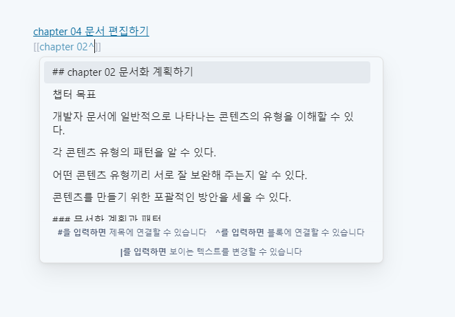 그리고 링크를 쓸 때 `[[노트이름#노트내부제목]]`으로 하여 해당 노트의 제목이 있는 곳으로 바로가기도 가능하고, `[[노트이름^문단]]`으로 해서 노트의 특정 문단으로 바로 갈 수도 있습니다. 하지만 뭔가 불편한 알파벳들이 나옵니다. 그래서 지정한 텍스트로만 링크가 보여지게 할 겁니다. `[[노트 링크 | 원하는 텍스트]]`로 쓰는 겁니다.