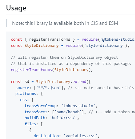 이제 토큰을 가공할 차례입니다. 저는 css를 사용할 거라 @tokens-studio/sd-transforms 패키지를 사용할 것입니다. 이 패키지도 토큰 스튜디오에서 제공합니다. 여기에서 단점은 리드미가 최신 버전을 반영하고 있지 않다는 것입니다.