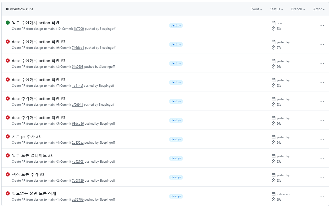 이번이 피그마와 github을 연동시키고 디자인 토큰을 가공하는 것에 대한 2번째 경험이었습니다. github action도 마찬가지였습니다. 첫번째에서는 github action 실패만 50번 넘게 한 것 같습니다. 이번에는 어떻게 돌아가는지 알고 에러 메세지도 잘 파악할 수 있었고, 로컬에서도 테스트 할 수 있다는 걸 깨닫게 되어 10번에서 그친 것 같습니다. (이번만 action이 성공한 걸 수도 있죠) 그동안 성장한 걸 새삼 느끼고 아직 배울 게 많다는 걸 다시 깨달았습니다. 화이팅!!