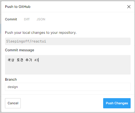 먼저 디자인 토큰들이 잘 들어왔는지 확인해줍니다. design 브랜치에 연결되어 있고, 토큰이 잘 정리되었으니 바로 push하여 github으로 디자인 토큰 정보가 있는 json 파일을 보내줍니다.